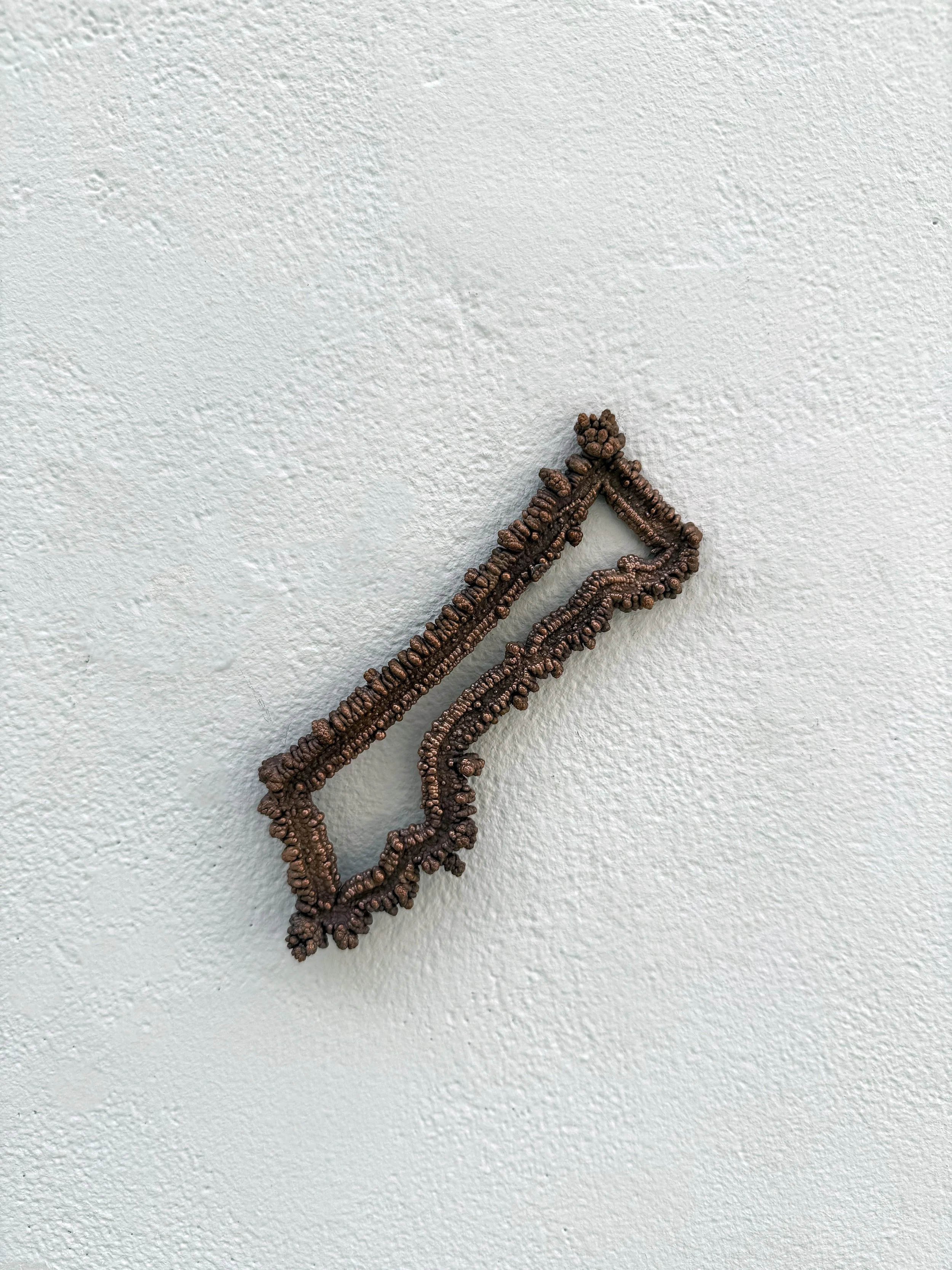 Cette série de six pièces interroge la matérialité et la symbolique des frontières géopolitiques contemporaines. J’ai choisie le verre à vitre comme support : un matériau transparent et fragile, qui évoque à la fois la possibilité d’un passage et la rigidité d’une paroi invisible. Chaque pièce adopte le format du drapeau, soulignant le rôle des États-nations dans la construction des identités collectives et des divisions territoriales. Les lignes de démarcation entre pays – Corée du Sud et Corée du Nord, États-Unis et Mexique, Inde et Pakistan, Ukraine et Russie – sont inscrites sur le verre par électrolyse du cuivre. Ce procédé, qui consiste à déplacer le métal dans l’eau grâce à un courant électrique, confère une dimension performative au geste : l’énergie invisible devient matérialité, comme le pouvoir politique transforme des tracés arbitraires en frontières tangibles.